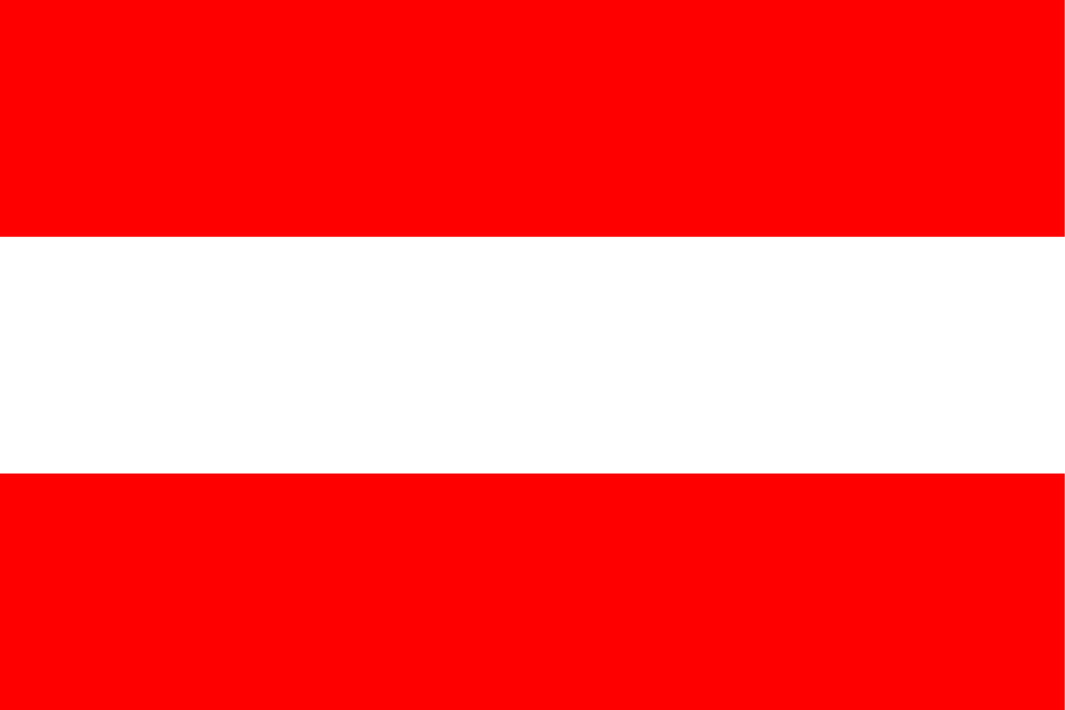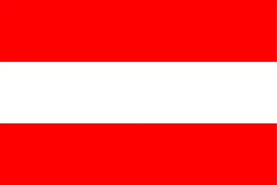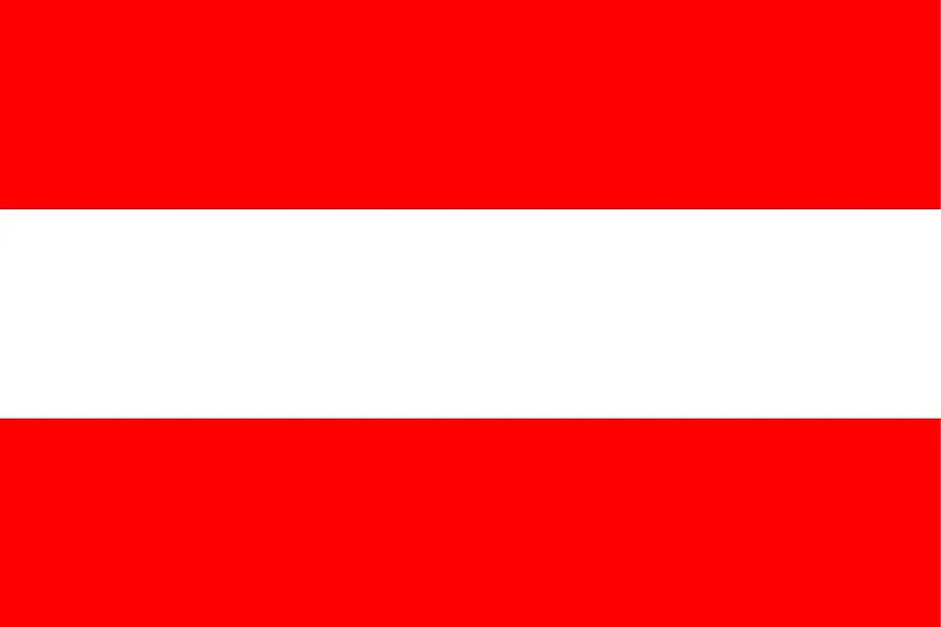 The Austrian flag is a rectangular triband flag with colors red and white. The three equal horizontal bands are arranged with red at the top and bottom with a white band in the middle. A variant of the flag that was used as the state flag, ensign and war flag has the Coat of Arms of Austria charged at the center. The red color of the flag is associated with love, open-mindedness, war, and supremacy hence signifying strength and bravery. The white color symbolizes truth and honesty. Both the national flag and the naval ensign have a height to length proportion of 2:3.