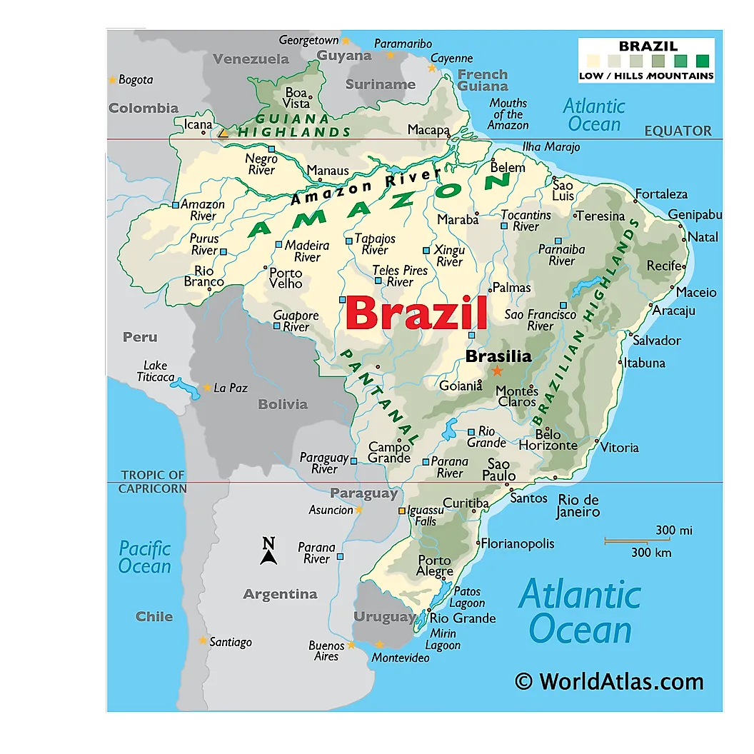 Brazil's Northern Region holds the Amazon Rainforest, which occupies nearly half of the country. This region includes the states of Acre, Amapá, Amazonas, Pará, Rondônia, Roraima, and Tocantins. The dense rainforest and the immense network of rivers, including the Amazon River, the world's second-longest, play a crucial role in the global climate system and are rich with biodiversity. Also situated in the north is Brazil's highest point : Pico da Neblina at 9,823ft (2,999m) (marked on the map by a yellow upright triangle).