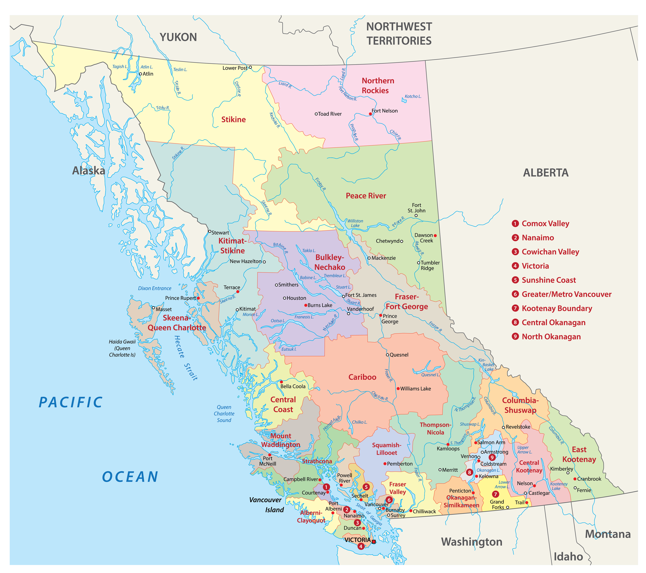 The Canadian Province of British Columbia is administratively divided into 26 regional districts. In alphabetical order, these regional districts are Alberni-Clayoquot, Bulkley-Nechako, Capital, Cariboo, Central Coast, Central Kootenay, Central Okanagan, Columbia-Shuswap, Comox Valley, Cowichan Valley, East Kootenay, Fraser Valley, Fraser-Fort George, Kitimat-Stikine, Kootenay Boundary, Metro Vancouver, Mount Waddington, Nanaimo, North Coast, North Okanagan, Northern Rockies, Okanagan-Similkameen, Peace River, qathet, Squamish-Lillocet, Strathcona, Sunshine Coast, and Thompson-Nicola.