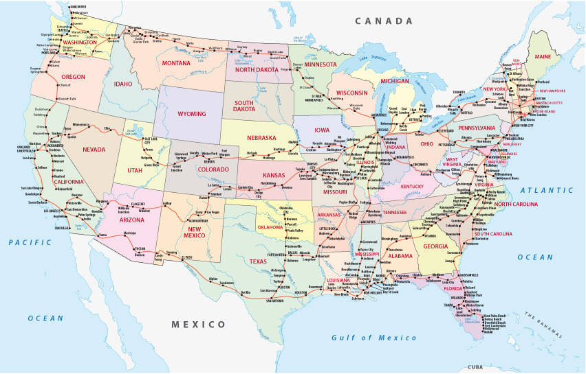 The map above shows the location of the United States within North America, with Mexico to the south and Canada to the north. Found in the Norhern and Western Hemispheres, the country is bordered by the Atlantic Ocean in the east and the Pacific Ocean in the west, as well as the Gulf of Mexico to the south.