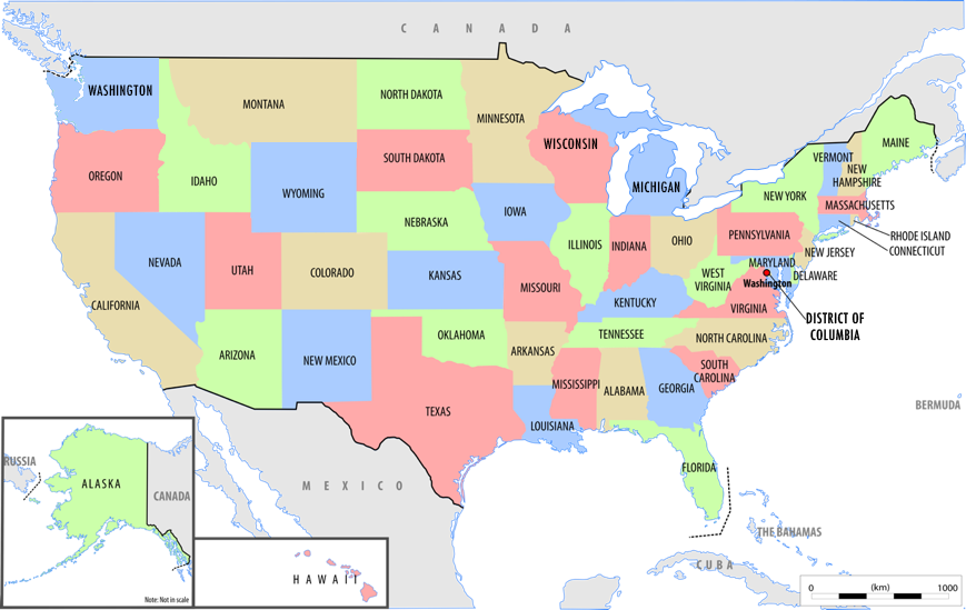 The 50 states are the major administrative divisions of the country. In alphabetical order, these states are: Alabama, Alaska, Arizona, Arkansas, California, Colorado, Connecticut, Delaware, District of Columbia, Florida, Georgia, Hawaii, Idaho, Illinois, Indiana, Iowa, Kansas, Kentucky, Louisiana, Maine, Maryland, Massachusetts, Michigan, Minnesota, Mississippi, Missouri, Montana, Nebraska, Nevada, New Hampshire, New Jersey, New Mexico, New York, North Carolina, North Dakota, Ohio, Oklahoma, Oregon, Pennsylvania, Rhode Island, South Carolina, South Dakota, Tennessee, Texas, Utah, Vermont, Virginia, Washington, West Virginia, Wisconsin, Wyoming