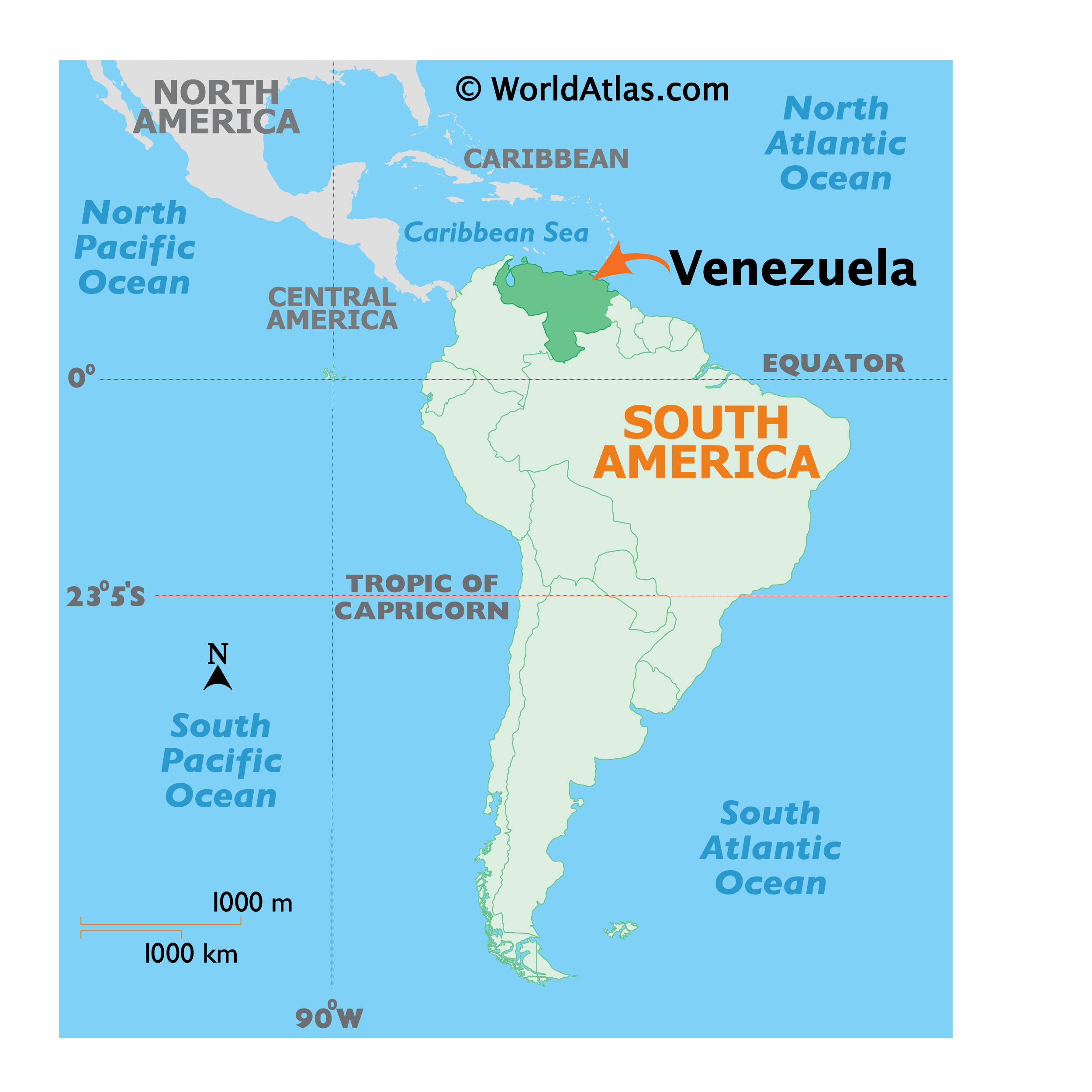 Covering a total area of 916,445 sq.km (353,841 sq mi), Venezuela, located on the northern coast of South America is the world's 33rd largest country. As observed on the physical map of Venezuela, the Orinoco River and Venezuela's mountain ranges divide the country into some distinct topographical regions, all with different climates.