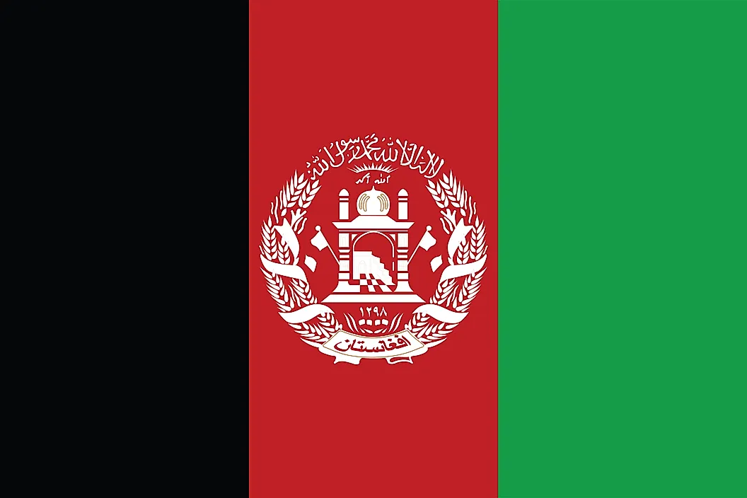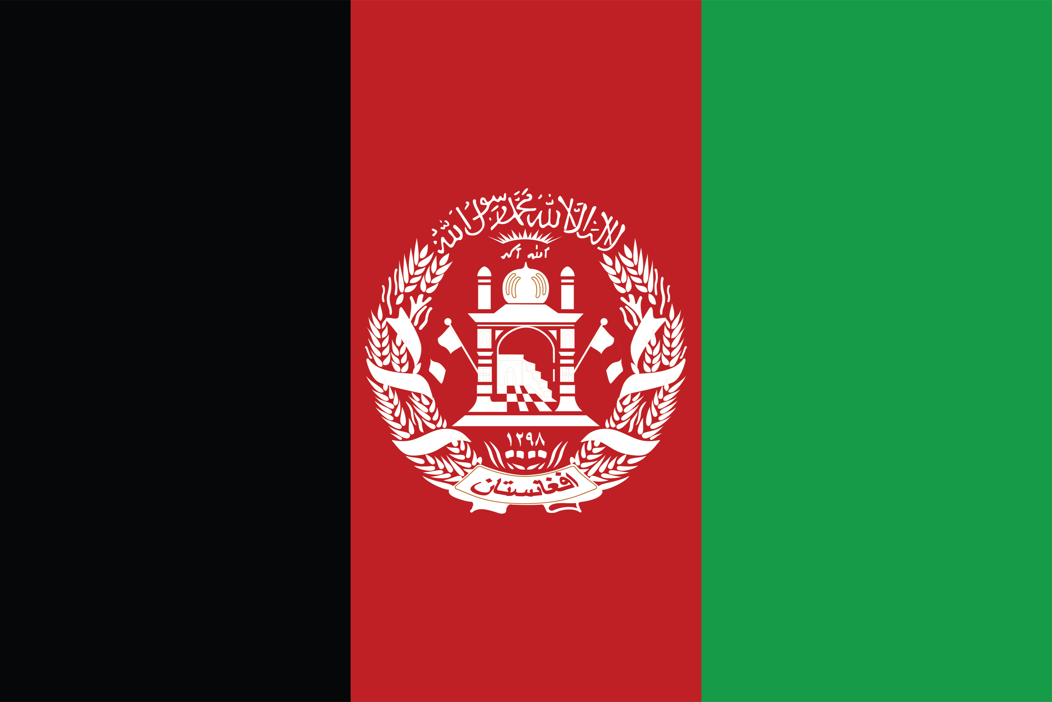 The National Flag of Afghanistan is a tricolor featuring three equal vertical bands of black (hoist side), red, and green. The classical National Emblem is portrayed in white at the center of the flag on the red band and slightly overlapping the green and the black bands. The country’s tumultuous past ridden with great difficulties has been symbolized in the country’s national flag. The black color depicts the dark past and the troubled history of Afghanistan dating back to the 19th century when the country was a protected state of the British Empire. The red color represents the bloodshed during the fight for independence, which came to an end with the signing of the Anglo-Afghan Treaty of 1919. The green color symbolizes the hope and prosperous Islamic future that keeps the nation alive despite its troubled history. The flag has a height to width proportion ratio of 2:3.
