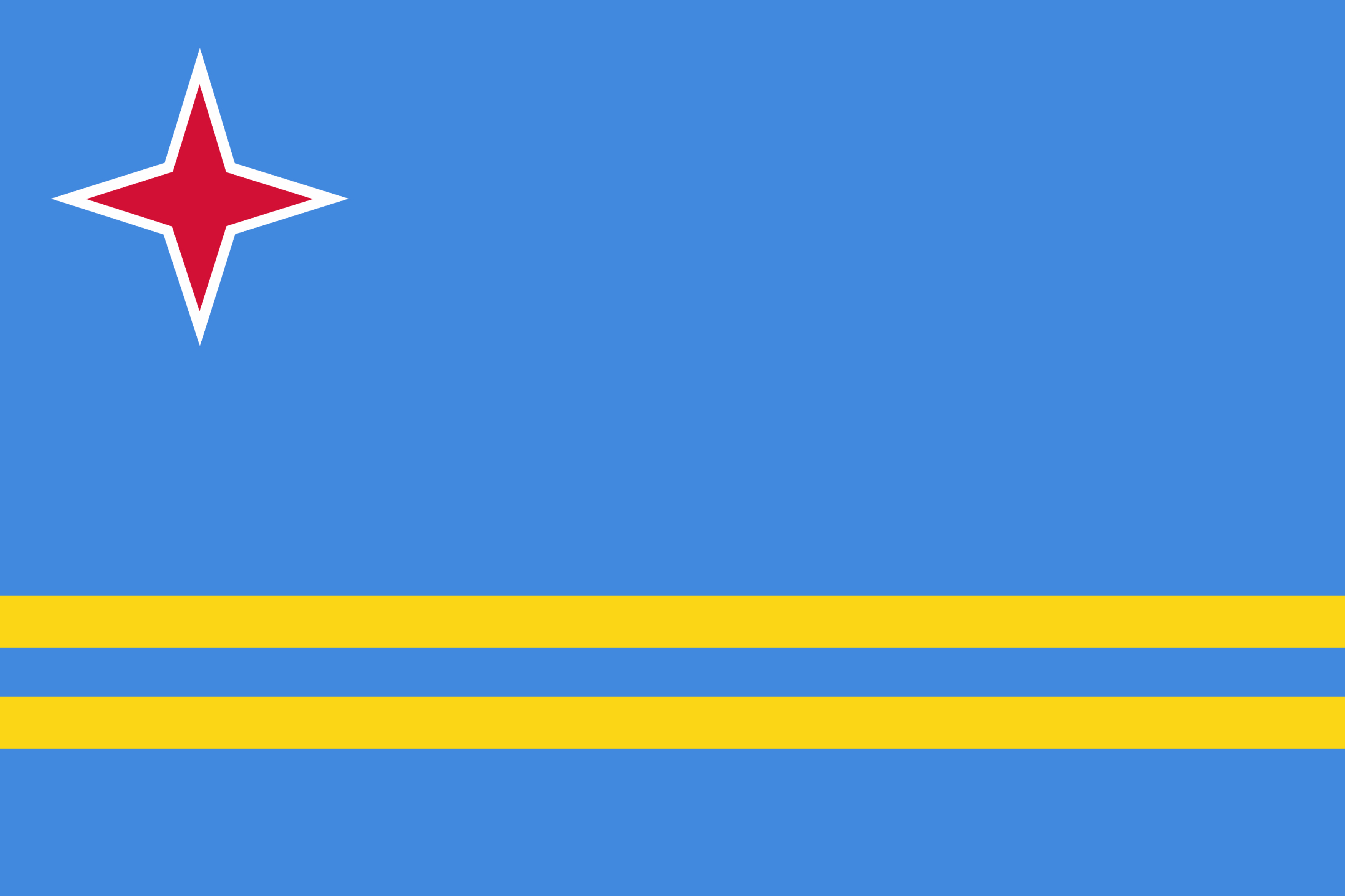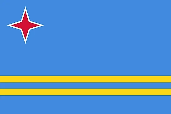 The light blue color symbolizes the Caribbean waters and skies and; was intentionally chosen to match the shade used in the United Nations flag. The ‘four-pointed white-fimbriated red star’ represents Aruba - its red soil and white sand beaches that ring it; as well as the pride of Arubans in their struggle for liberty for their island. The four points symbolize the four major languages (Papiamento, Dutch, Spanish, and English) as well as the four points of a compass, to indicate that its inhabitants come from all over the world. The two yellow stripes represent the island's two main "industries", the flow of tourists to the sun-drenched beaches and the flow of minerals from the earth. The color yellow also represents the flora of Aruba that bloom yellow. The flag’s width-to-length ratio is 2:3.