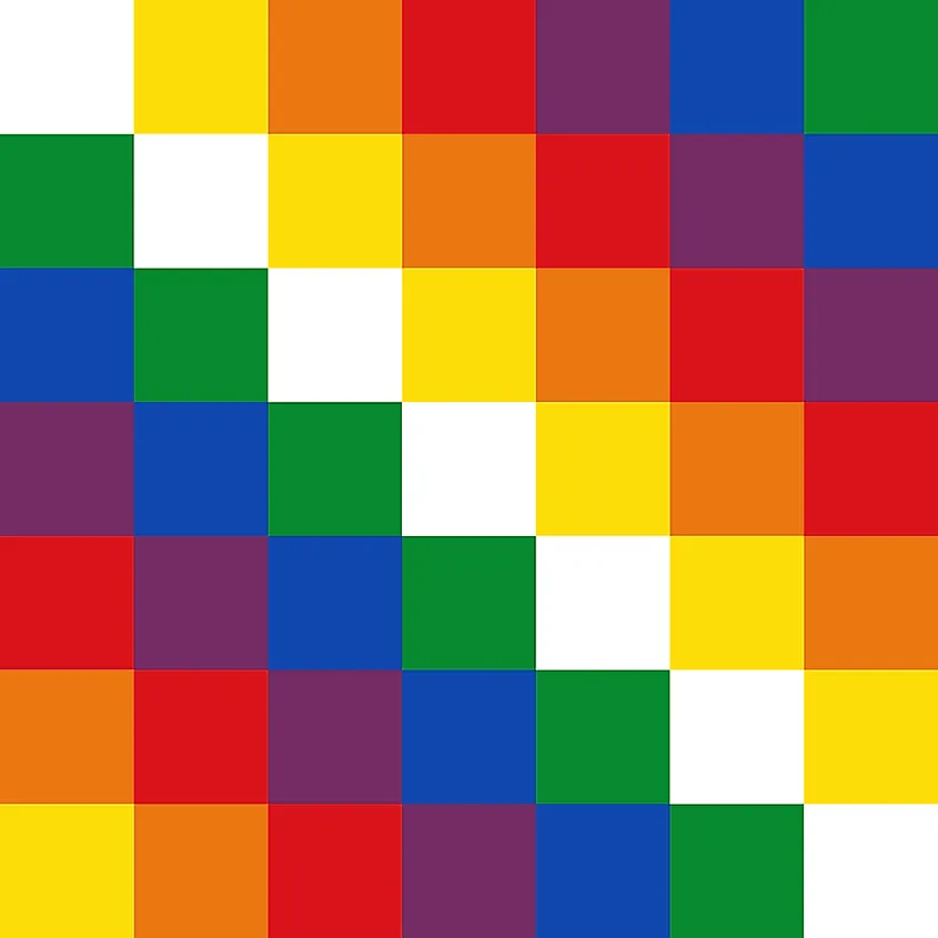 In 2009 Bolivia adopted the Wiphala as its alternative flag. The Wiphala is a 7x7 square emblem made up of 7 colors arranged diagonally left to right. The emblem represents the natives of the Andes and the four regions of the Incan Empire. The arrangement of the colors varied depending on the region, but the color on the longest arrangement represents that particular region. The white color represents Qullasuyu, the green represents Antisuyu, the yellow represents Kuntisuyu, and the red represents Chinchaysuyu.