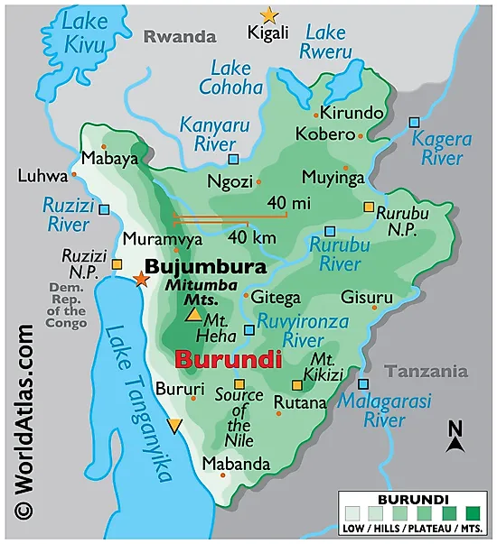 Physical Map of Burundi with state boundaries. Details the relief, physical features of the country, including mountain ranges, various bodies of water such as the Lake Tanganyika, major rivers, cities, extreme points, etc. worldatlas.com worldatlas.com tanzania burundi democratic republic of the congo large burundi map