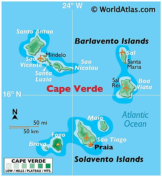 Cape Verde is an African island country located about 570 km off the western coast of Africa in the central Atlantic Ocean in the Northern and Western Hemispheres of the Earth.