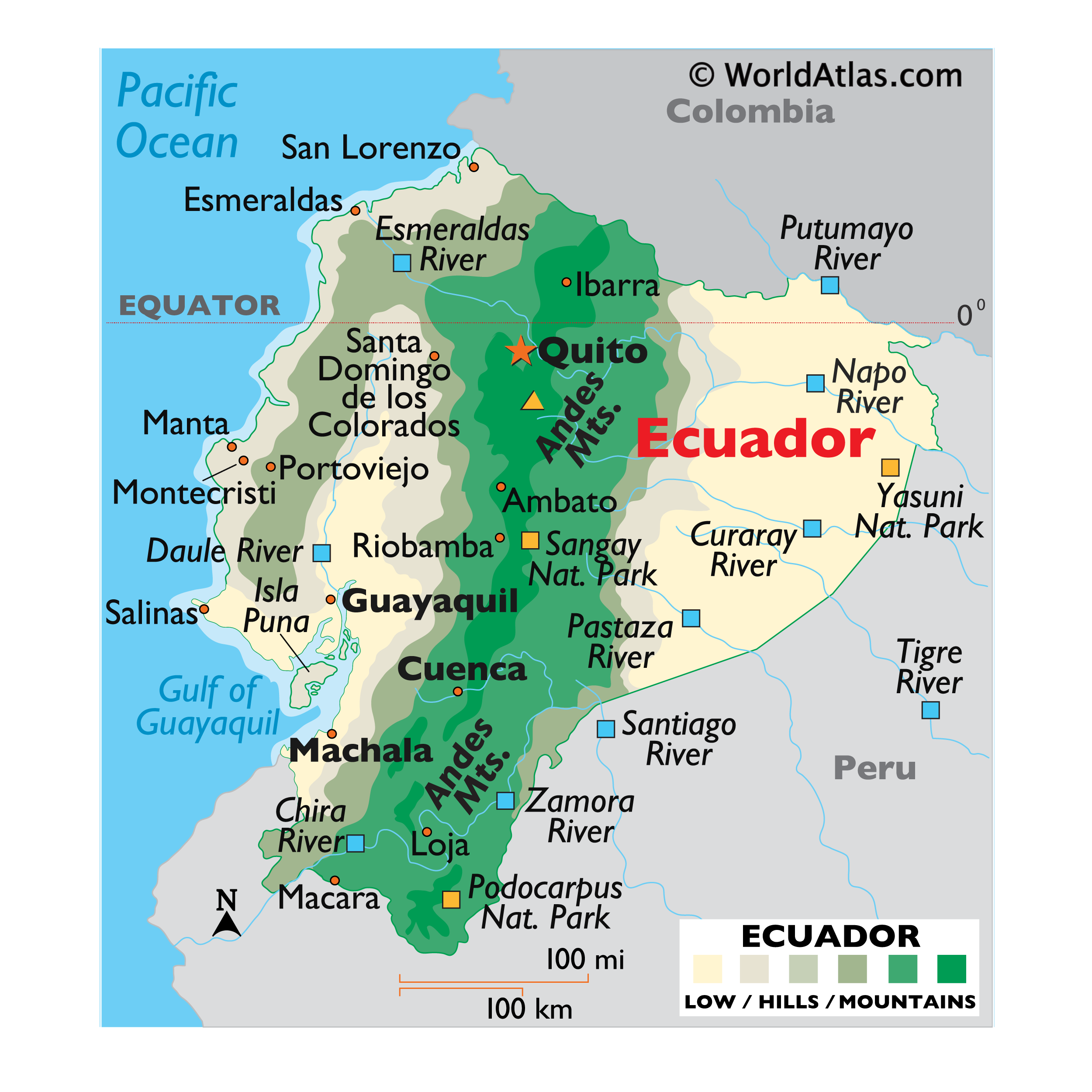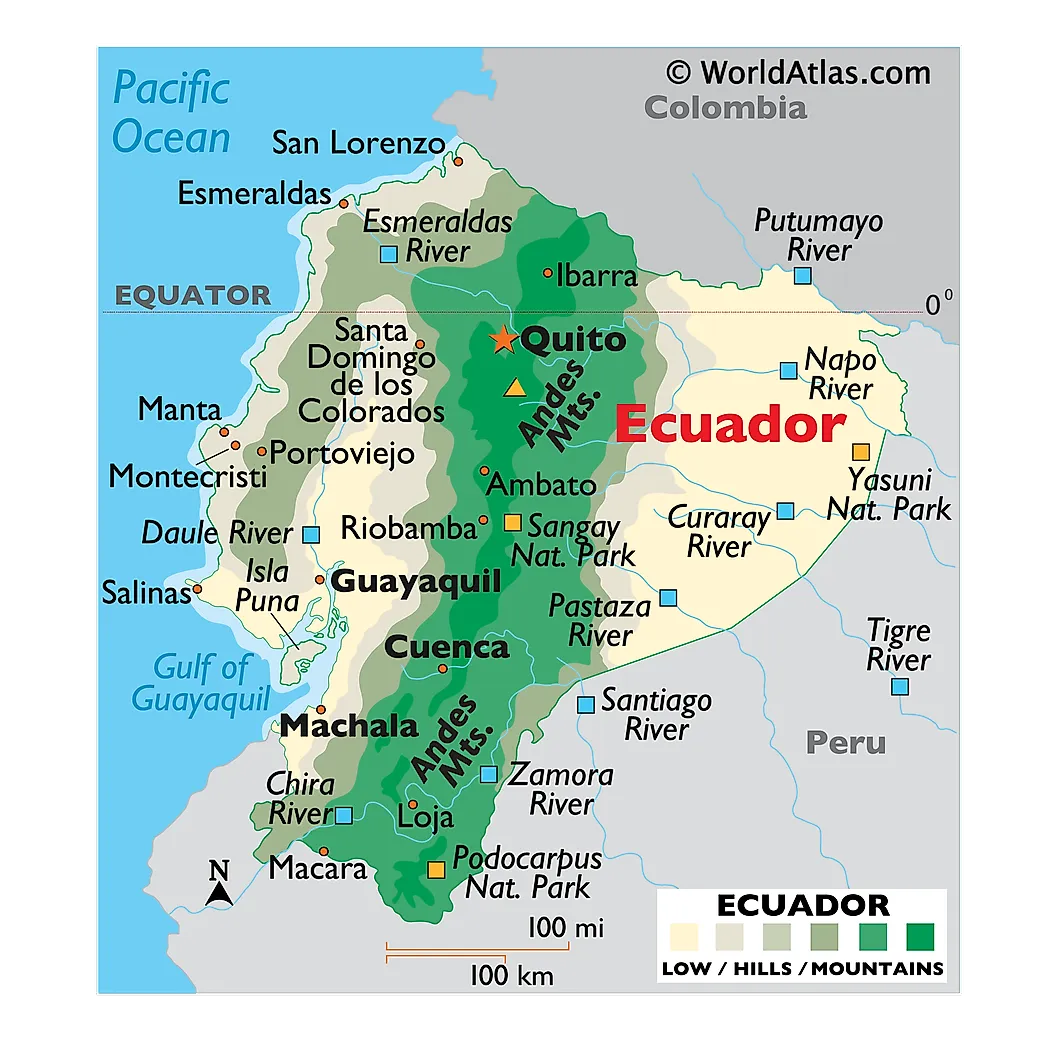 Physical Map of Ecuador showing relief, rivers, mountains ranges, important cities, bordering countries, and more.