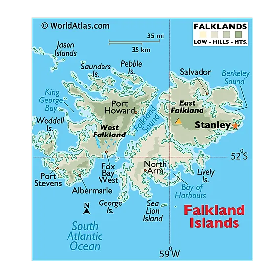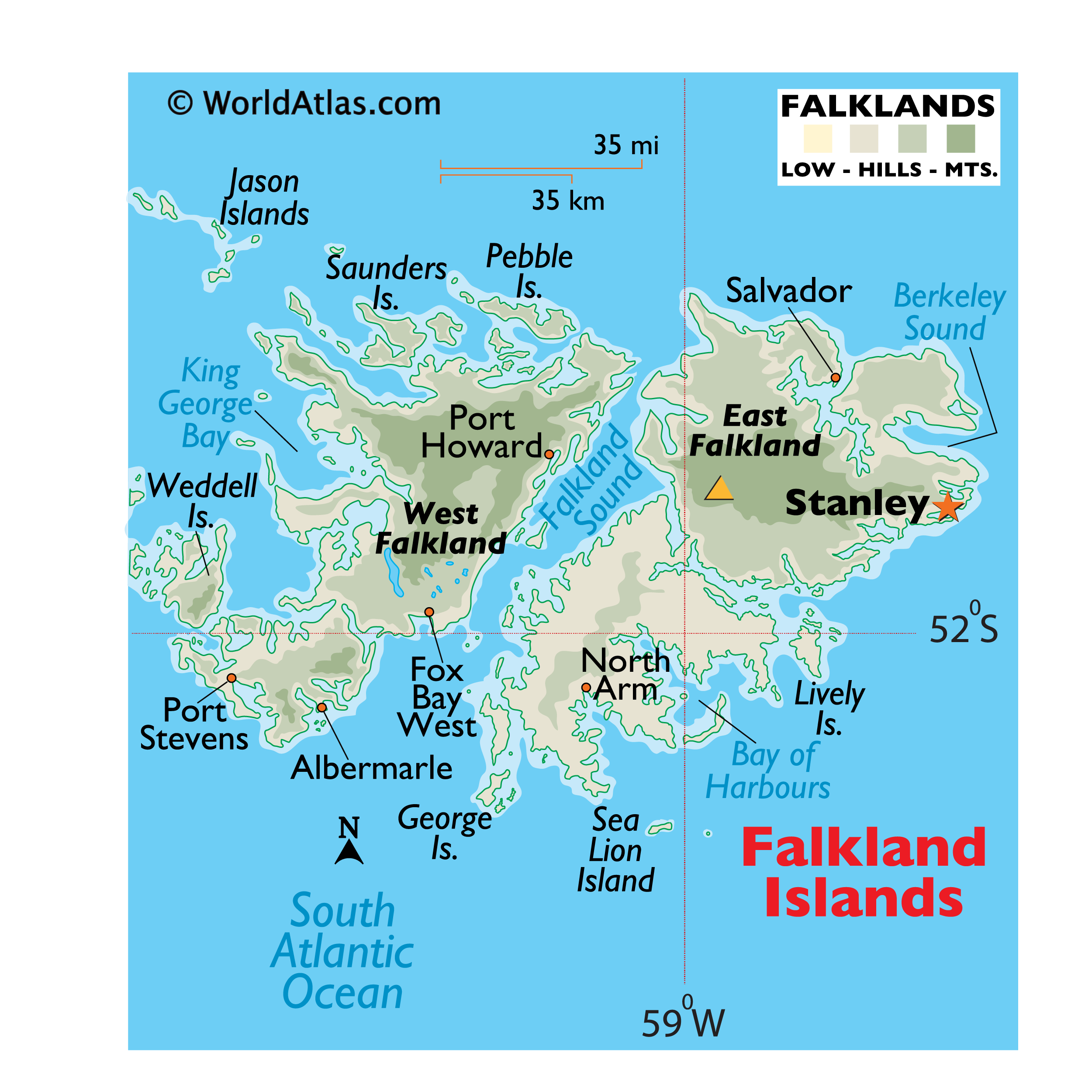 The Falkland Islands covers a total area of 12,173 sq.km (4,700 sq mi), and are an overseas territory of the United Kingdom in South Atlantic Ocean. As observed on the physical map above, The Falkland Islands are an archipelago comprised of two large islands (East Falkland and West Falkland) and several hundred smaller ones, that are ringed by a rugged coastline, and for the most part are hilly, rocky and covered with low shrubs and coarse grass. The two large islands are separated by Falkland Sound.