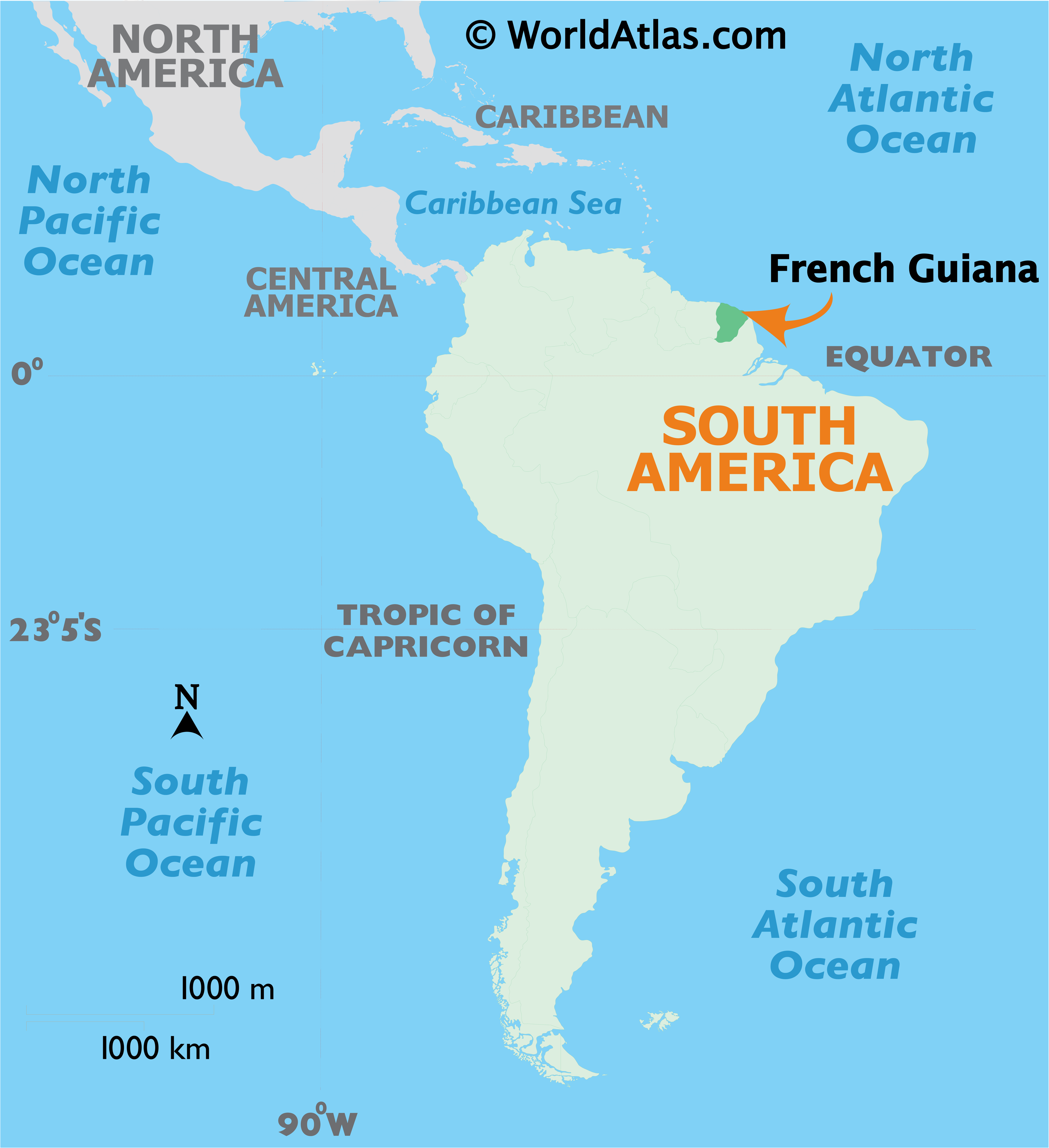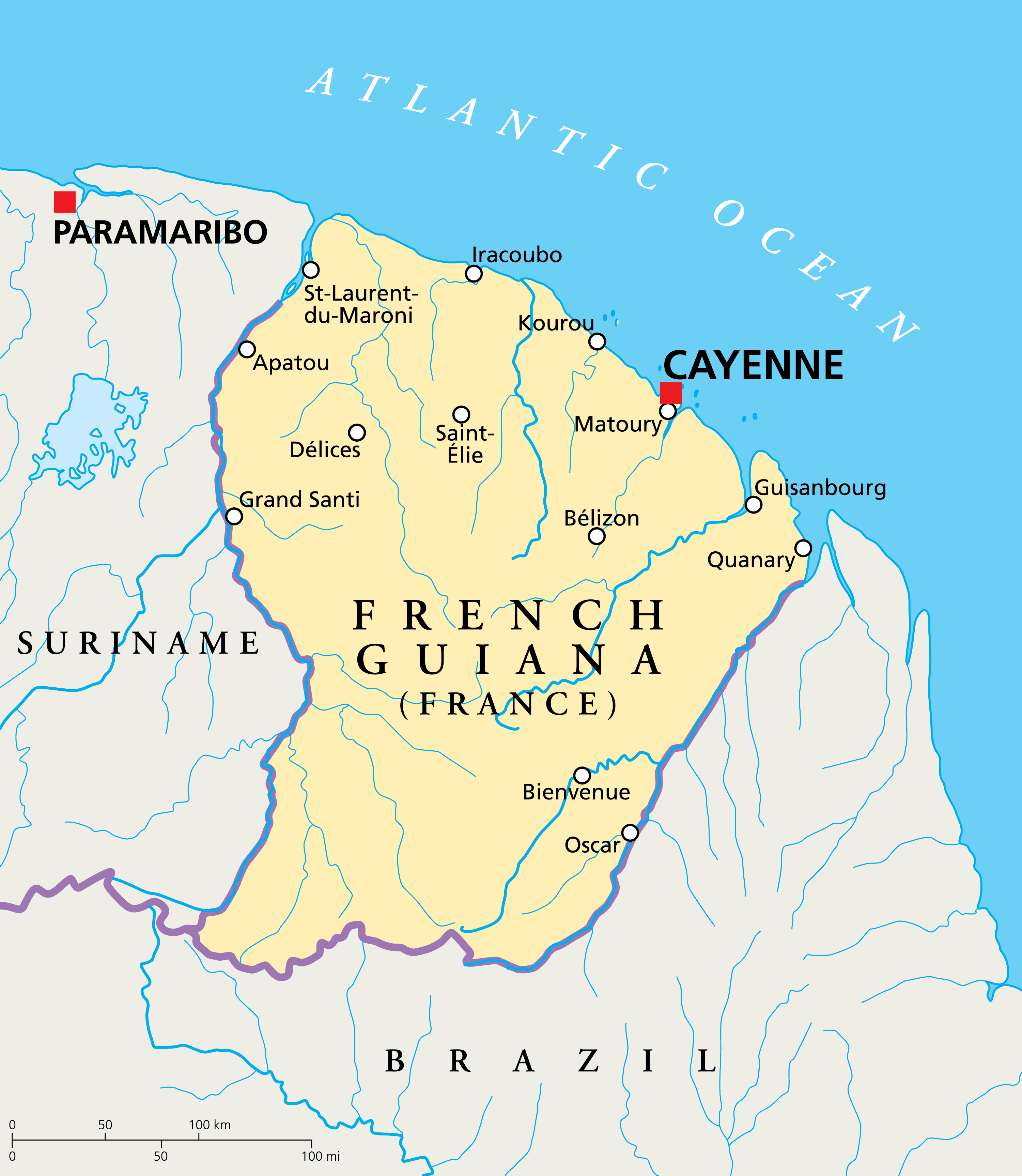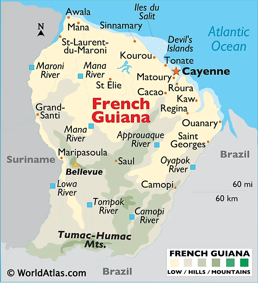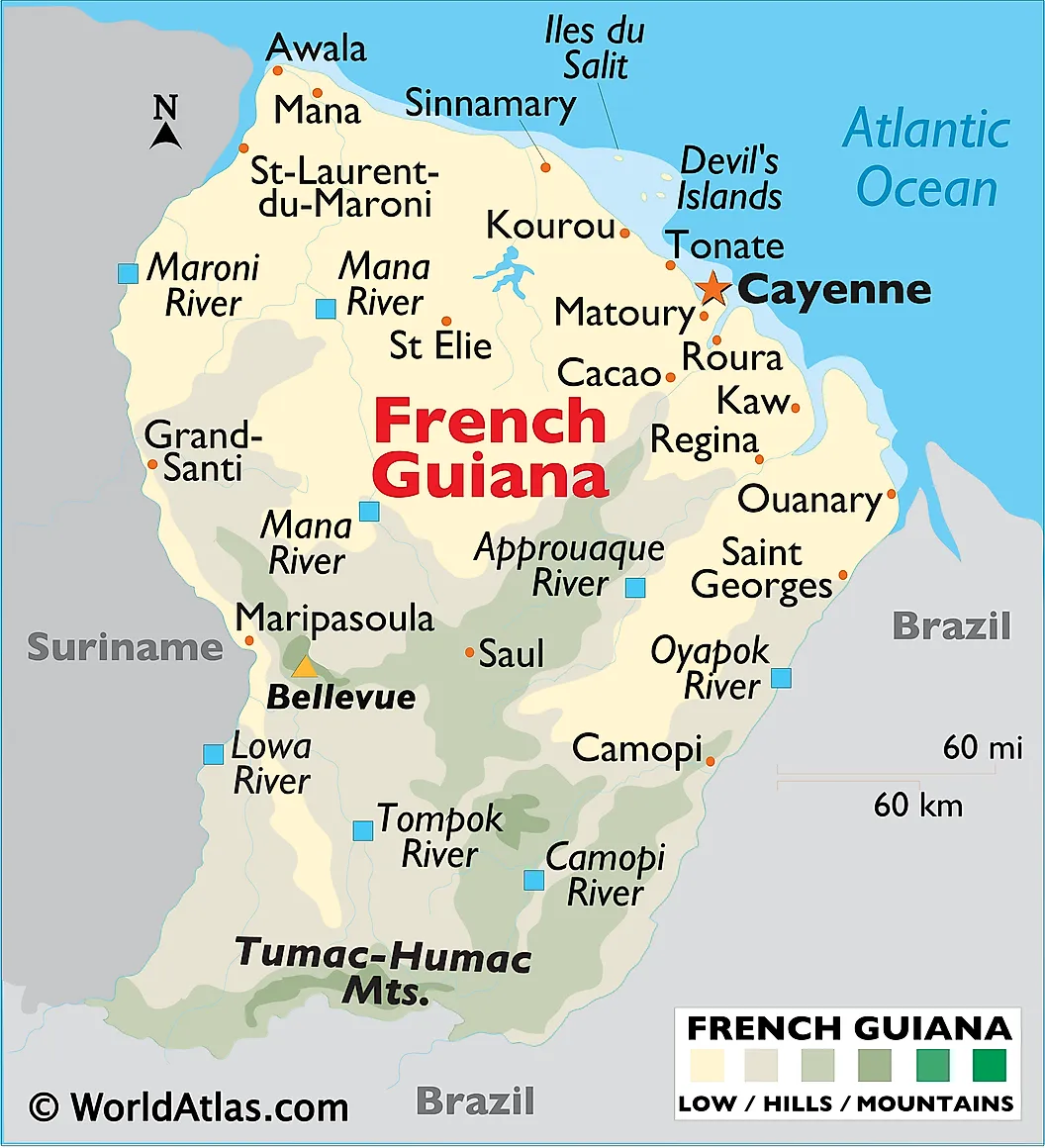 French Guiana is an overseas region and department of France that is located in the northeastern edge of South America. It is geographically positioned in the Northern and Western hemispheres of the Earth. French Guiana is bordered by Brazil in the east and south; by Suriname in the west and by the Atlantic Ocean in the northeast.
