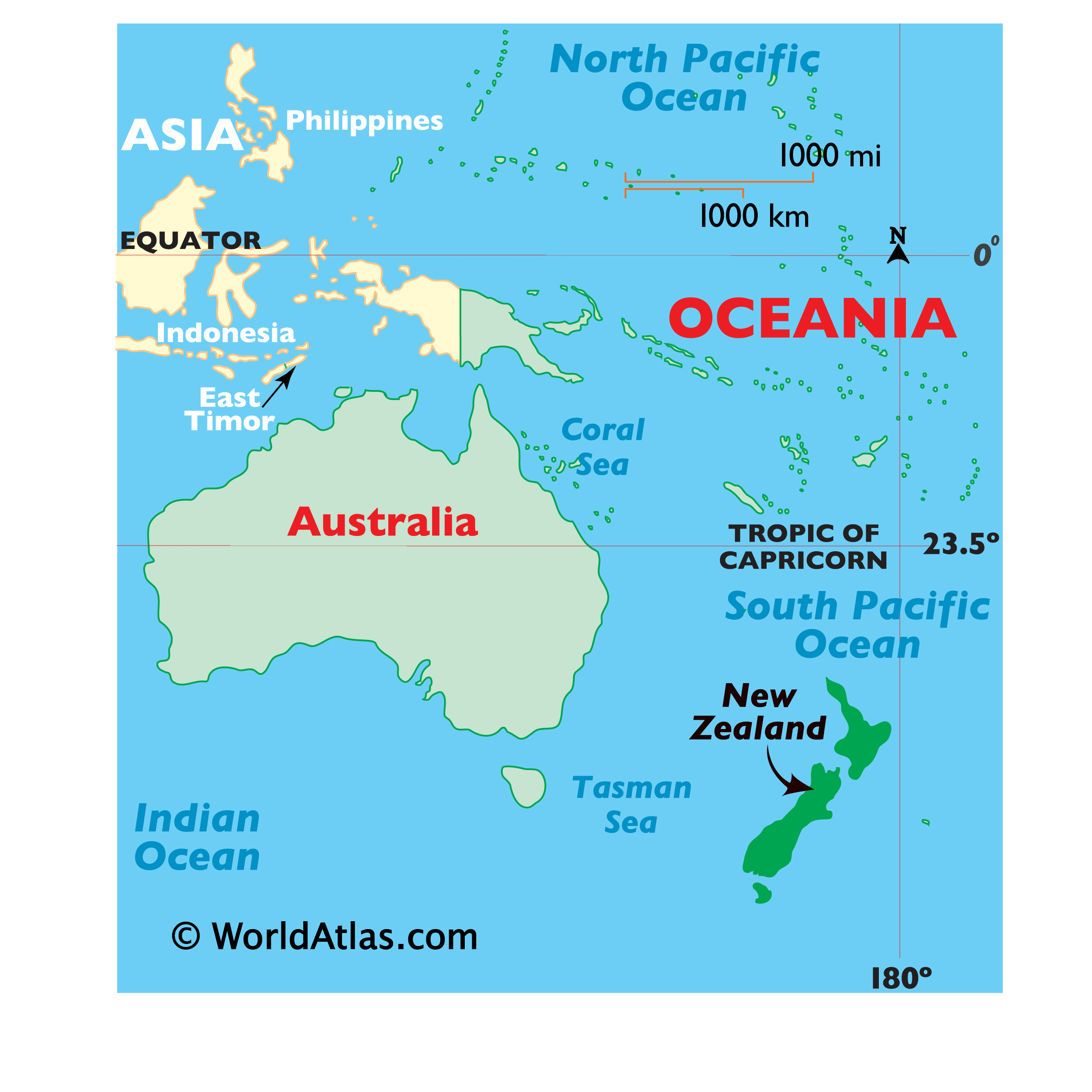 New Zealand is an island country and one of the many islands that make up Oceania. It is located in the South Pacific Ocean to the southeast of Australia, south of New Caledonia, Fiji and Tonga Islands. New Zealand is geographically positioned both in the Southern and Eastern hemispheres of the Earth. The island country is completely surrounded by the Pacific Ocean. New Zealand shares maritime borders with Australia, Tonga, Fiji and the other island countries in Oceania.