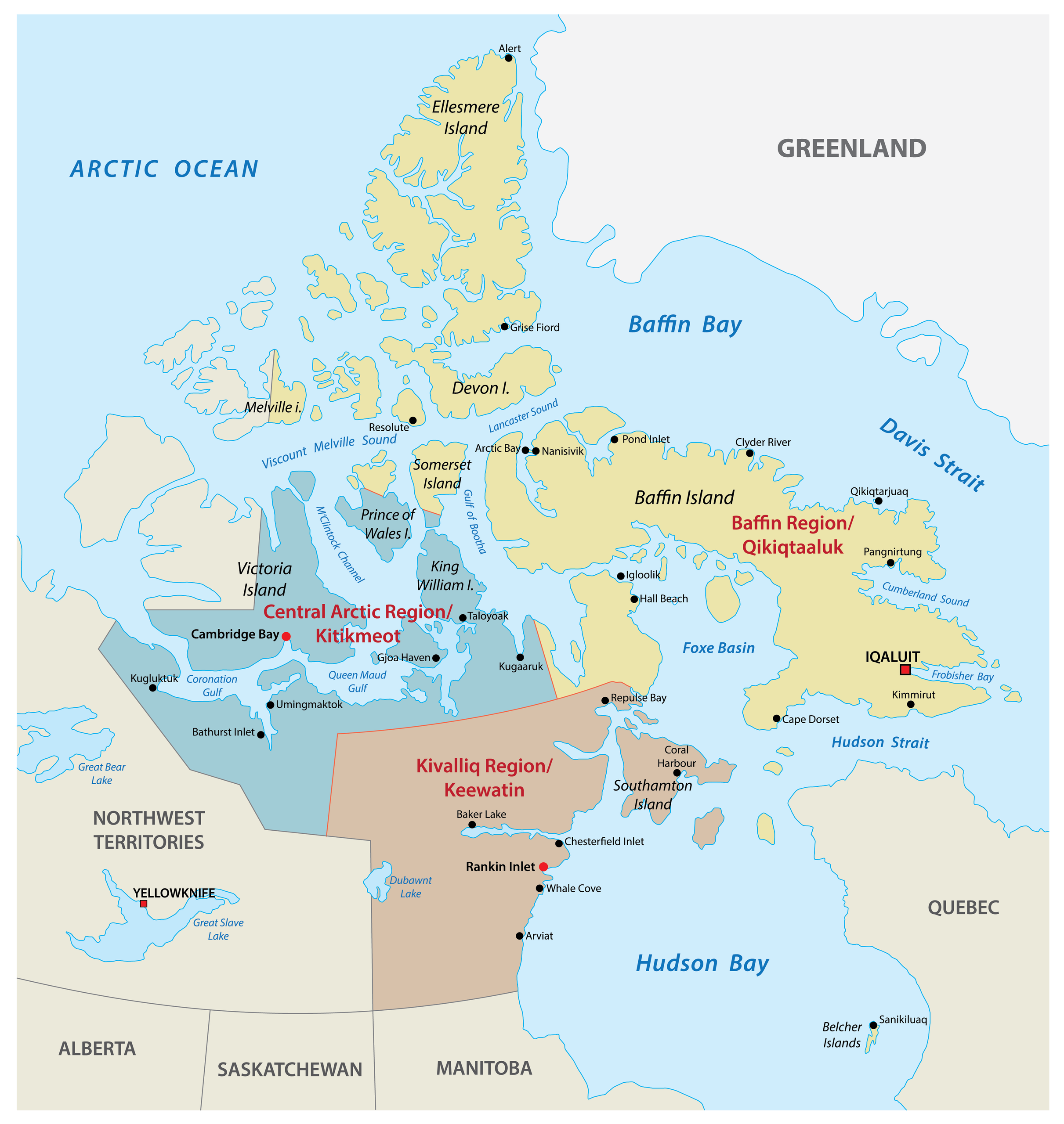 Nunavut is a Canadian territory that is administratively divided into 3 regions. In alphabetical order, these regions are Kitikmeot Region, Kivalliq Region, and Qikiqtaaluk (Baffin) Region. In 2003, the Government of Nunavut created a total of 25 municipalities (24 hamlets and 1 city).