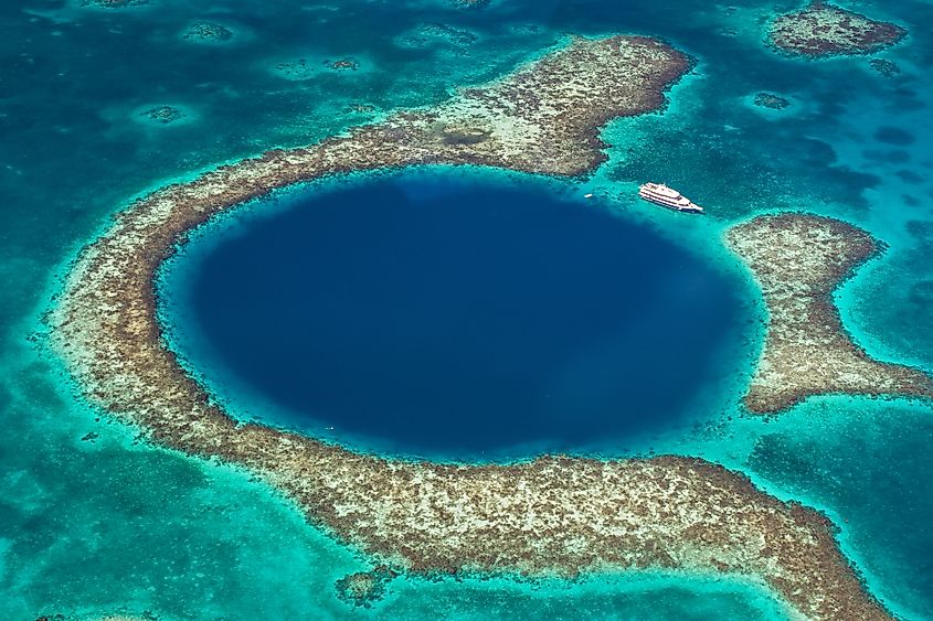 One of Belize’s most striking marine features is the Great Blue Hole, a nearly circular marine sinkhole located within the Lighthouse Reef Atoll. Rather than a lagoon, it is a collapsed limestone cavern whose vertical walls plunge more than 120 meters into the seafloor. The surrounding reef forms a bright ring of shallow water, sharply contrasting with the deep indigo of the sinkhole and making it one of the most iconic dive sites in the world.
