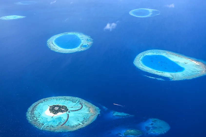 Atoll lagoons form in a different way from coastal lagoons, developing inside ring-shaped coral reef systems that surround a central basin. These reefs grow around volcanic islands in tropical oceans. Over hundreds of thousands of years, the volcanic island slowly subsides as the underlying crust cools and sinks. Coral continues to grow upward toward the light, eventually forming a circular or oval reef while the island itself disappears below sea level. The enclosed water left behind becomes the atoll lagoon. Atolls are especially common in the tropical Pacific and Indian Oceans, where warm, clear water supports extensive coral growth.